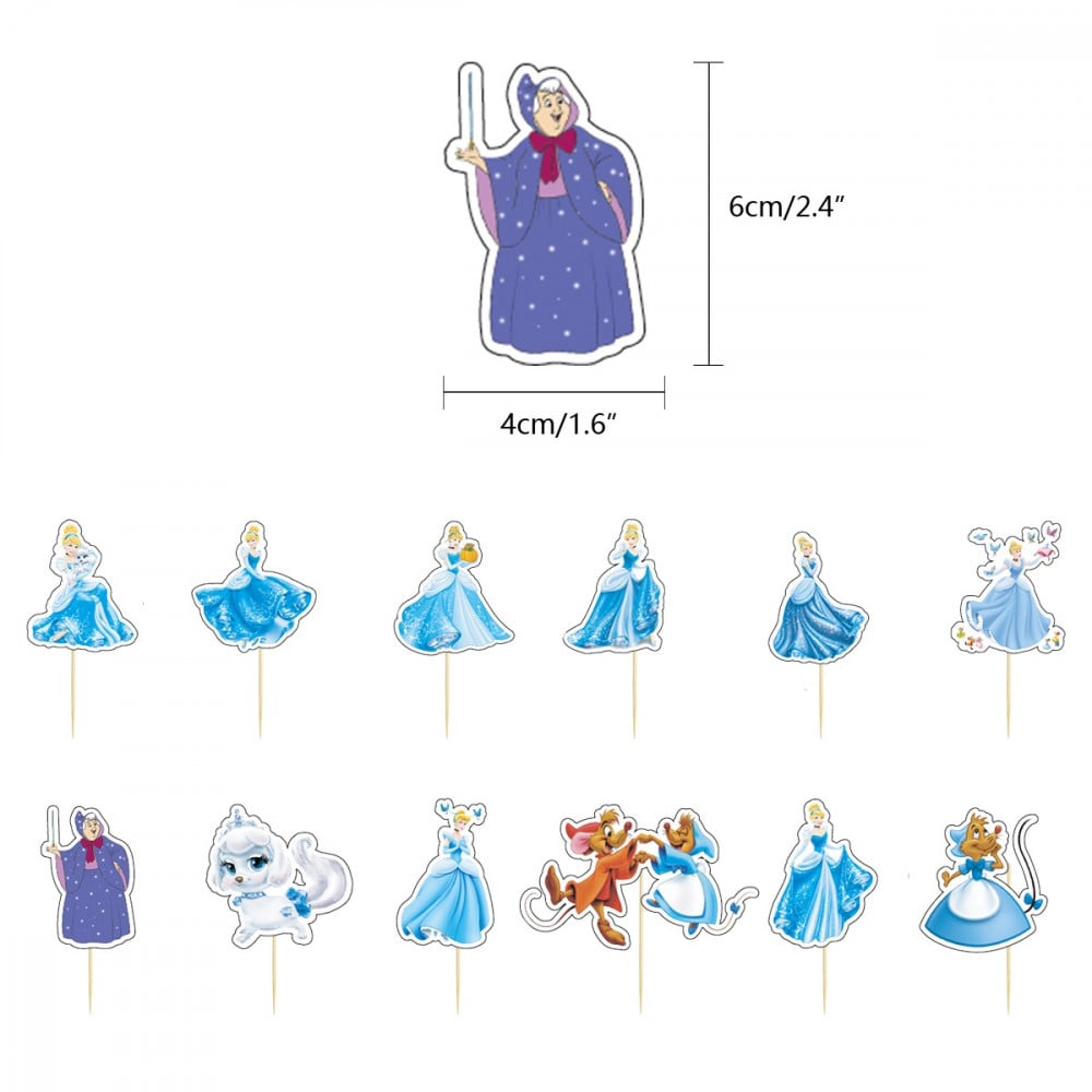 - مكونات: ديكور جداري "Happy Birthday"، بالونات ملونة برسومات سندريلا، زينة كعك وكب كيك، كيك توبر