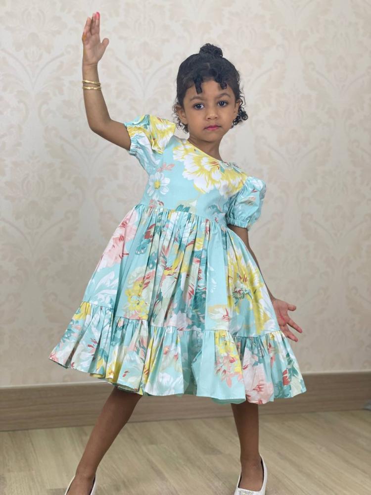 فستان ازرق فاتح بطبعات ورد والوان زاهية